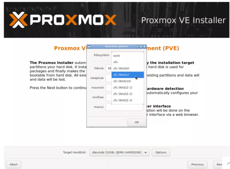 Wählen Sie bei Filesystem zfs (RAID1) aus.